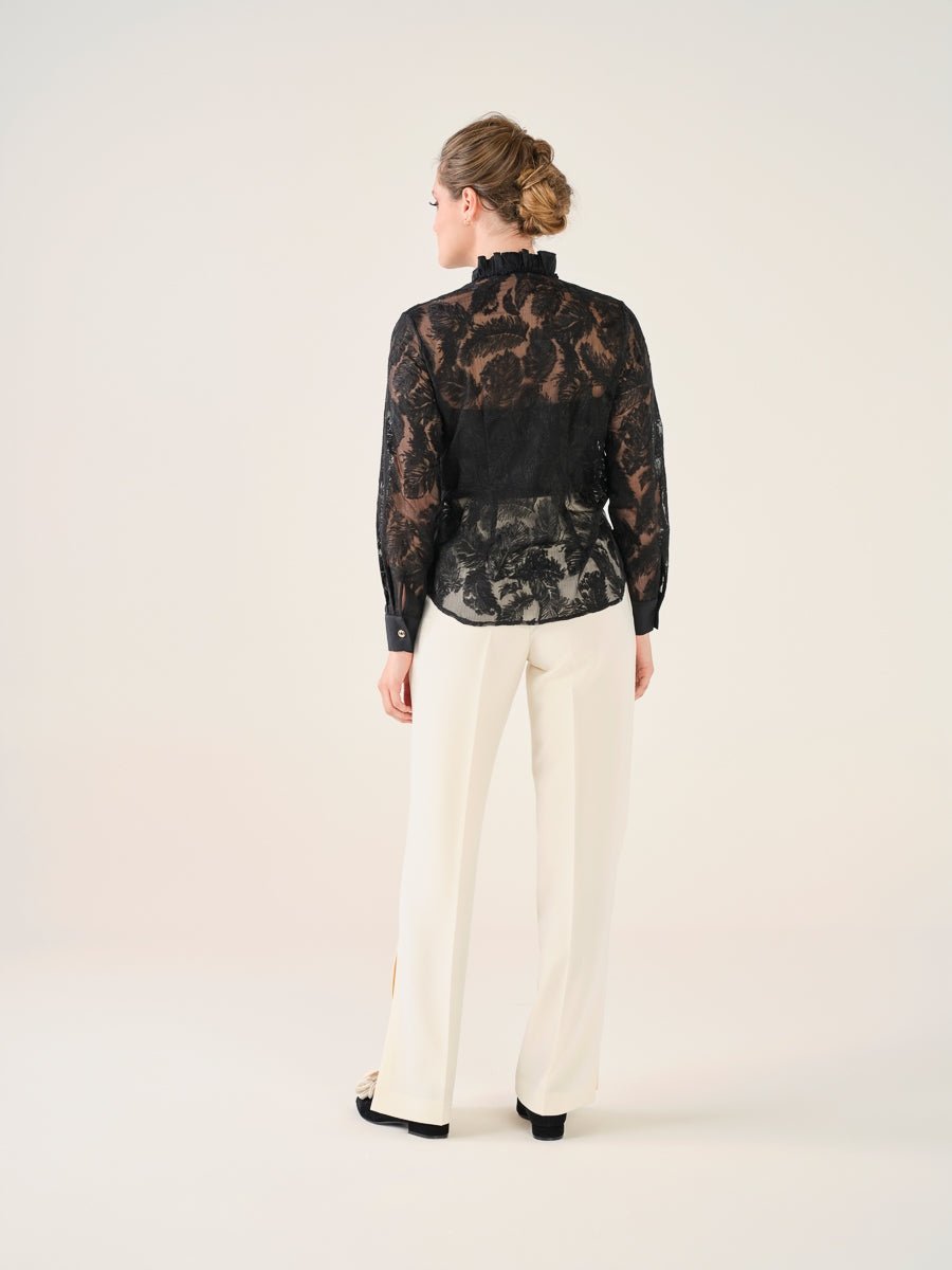 Deze verfijnde zwarte blouse van Cristina Barros ademt elegantie en vrouwelijkheid. Gemaakt van een luxe semi-transparante stof met subtiel ingeweven bloemenmotief, straalt deze blouse pure klasse uit. De romantische details zoals de ruffle langs de knoopsluiting en de elegante hoge hals geven de blouse een modieuze en chique uitstraling.