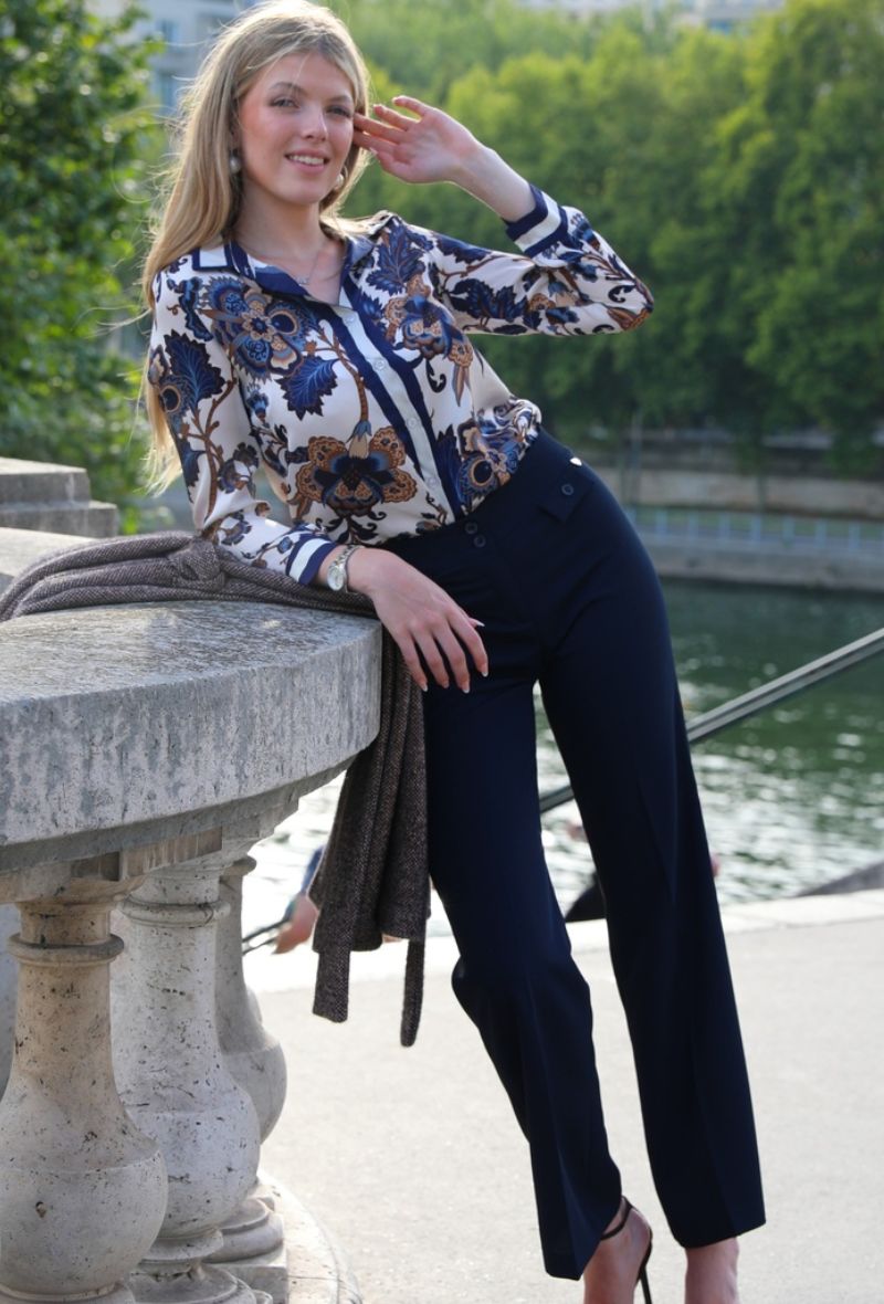 De Freeport blouse van Amélie & Amélie is een echte statement piece die luxe en stijl combineert. De blouse is uitgevoerd in een prachtige satijnlook stof met een opvallende bloemenprint in navy, crème en warme goudtinten.