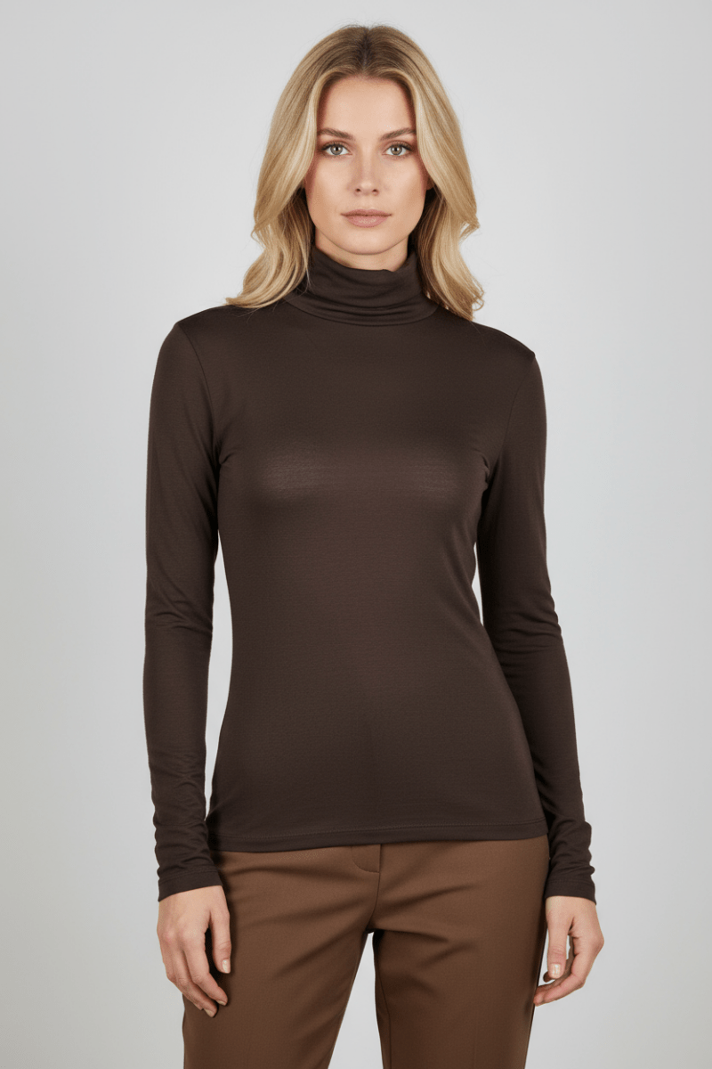 Naast deze diepe chocoladebruine kleur is de Glendale Coltrui Longsleeve in de winkel ook verkrijgbaar in beige, bordeaux en camel.