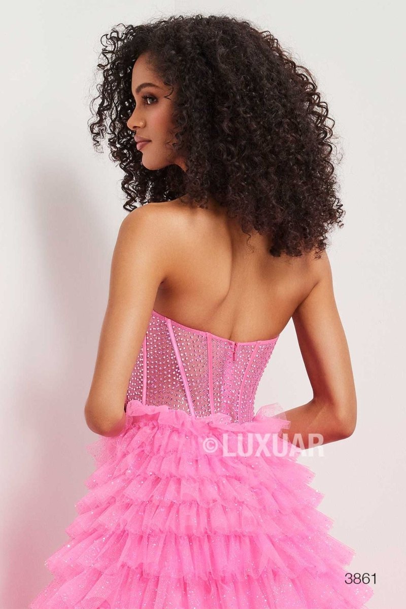 Betreed een sprookjesachtige wereld van vorstelijke pracht met onze schitterende gala jurk. Het prinses gehalte wordt naar nieuwe hoogten gebracht met de levendige kleuren en weelderige lagen van fel roze stof. Het strakke corset top met glitters benadrukt moeiteloos je koninklijke elegantie, terwijl het mouwloze ontwerp een moderne touch toevoegt aan je betoverende verschijning.