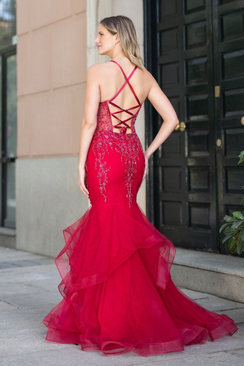 De jurk volgt het lichaam op elegante wijze en loopt vanaf de knieën uit in een sierlijke mermaid-rok van tule, die zorgt voor beweging en een indrukwekkend silhouet. De achterzijde is afgewerkt met een kruisende vetersluiting, wat niet alleen een verfijnd detail toevoegt maar ook een perfecte pasvorm garandeert.