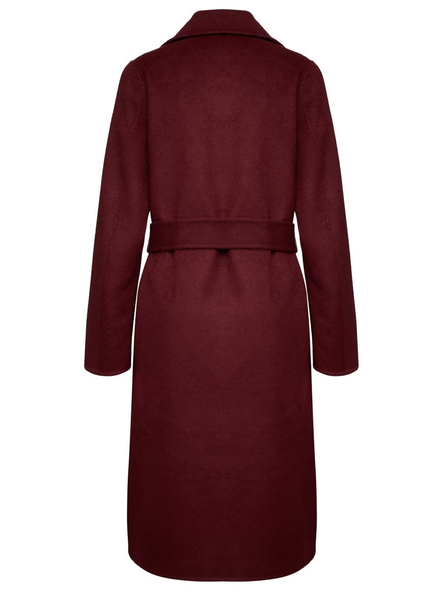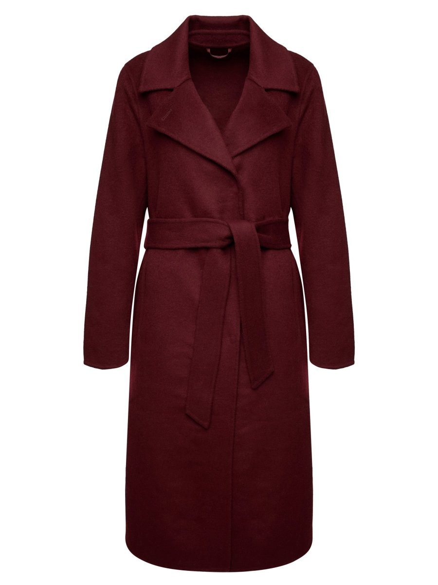 De diepe kleur geeft een luxe uitstraling, terwijl de zachte, warme stof perfect is voor de koelere maanden. De mantel is ontworpen met een klassieke reverskraag en een open voorkant die je kunt sluiten door de ceintuur te knopen voor een vrouwelijke en verfijnde look.