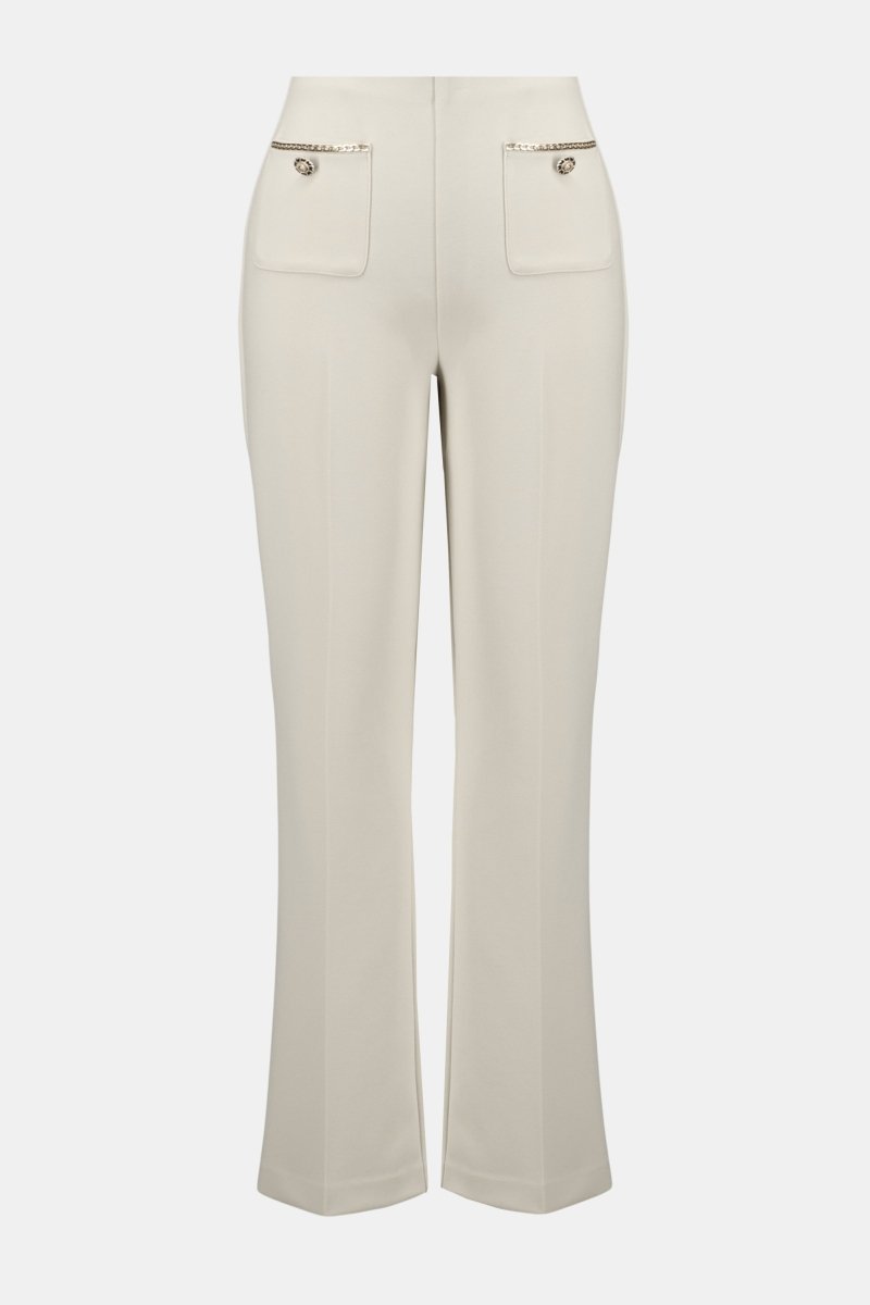 Blikvanger zijn de sierlijke voorzakken met goudkleurige kettingdetails en luxueuze knopen, die een chique en stijlvolle uitstraling geven. Verkrijgbaar in klassiek zwart of zacht crème, waardoor deze broek veelzijdig te combineren is: van een zakelijke blouse tot een feestelijke top.