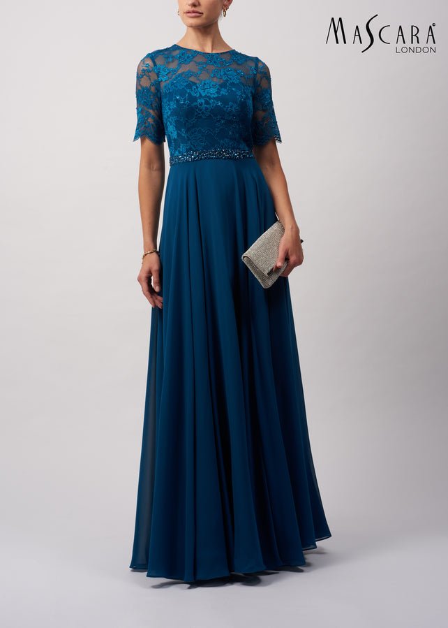 Deze prachtige curvy jurk heeft een drie kwart mouw gemaakt van kant en dit geeft een zeer chique uitstraling. In de taille zitten mooie steentjes verwerkt en van daruit loopt de jurk zwierig uit.