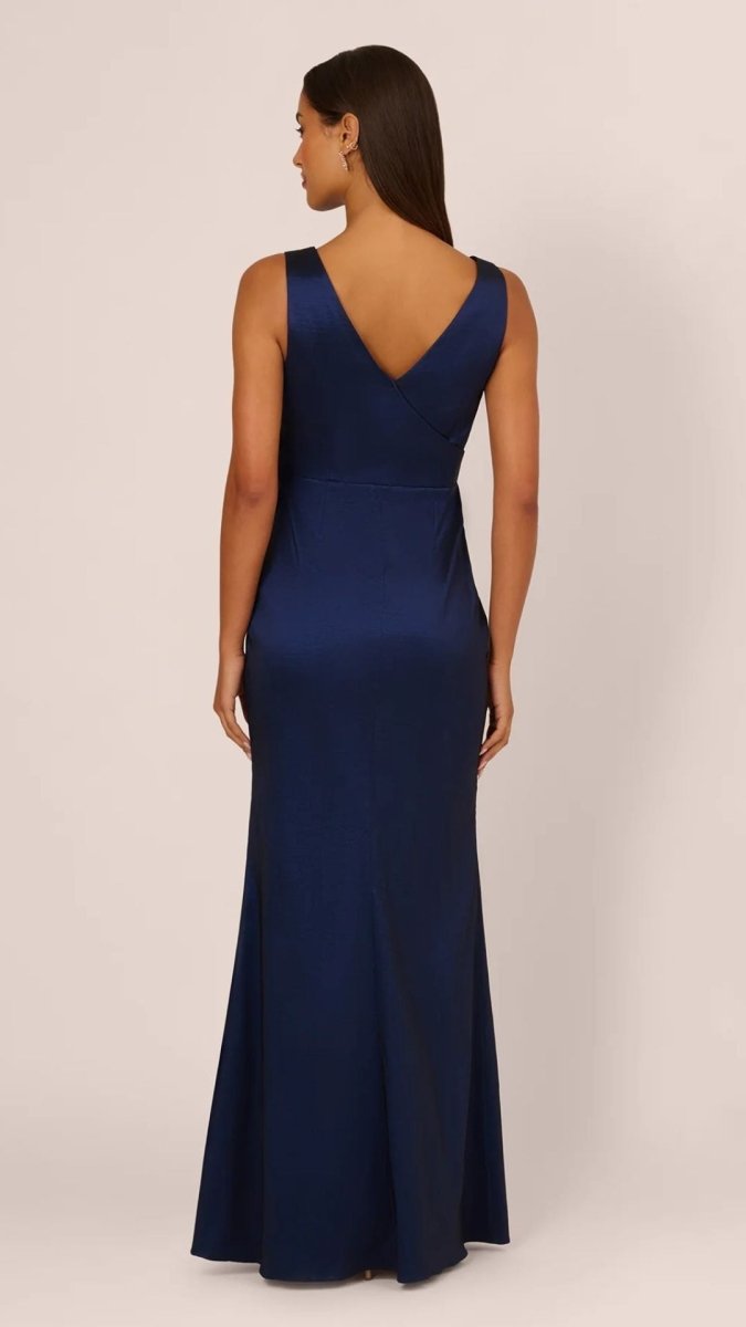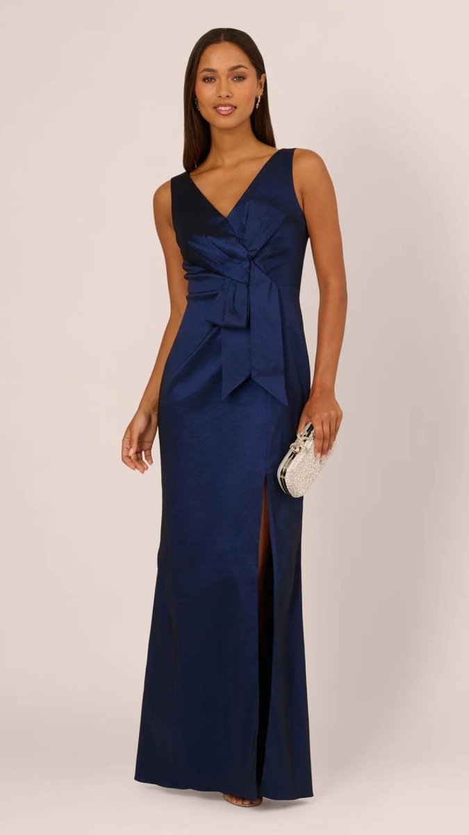 Het ontwerp wordt gekenmerkt door een flatterende V-hals en een sculpturale strikdetail aan de voorzijde, wat de jurk een couture-achtige uitstraling geeft. De taille wordt subtiel geaccentueerd, terwijl de lange rok soepel naar beneden valt en eindigt in een elegante split aan de zijkant voor precies de juiste dosis allure.