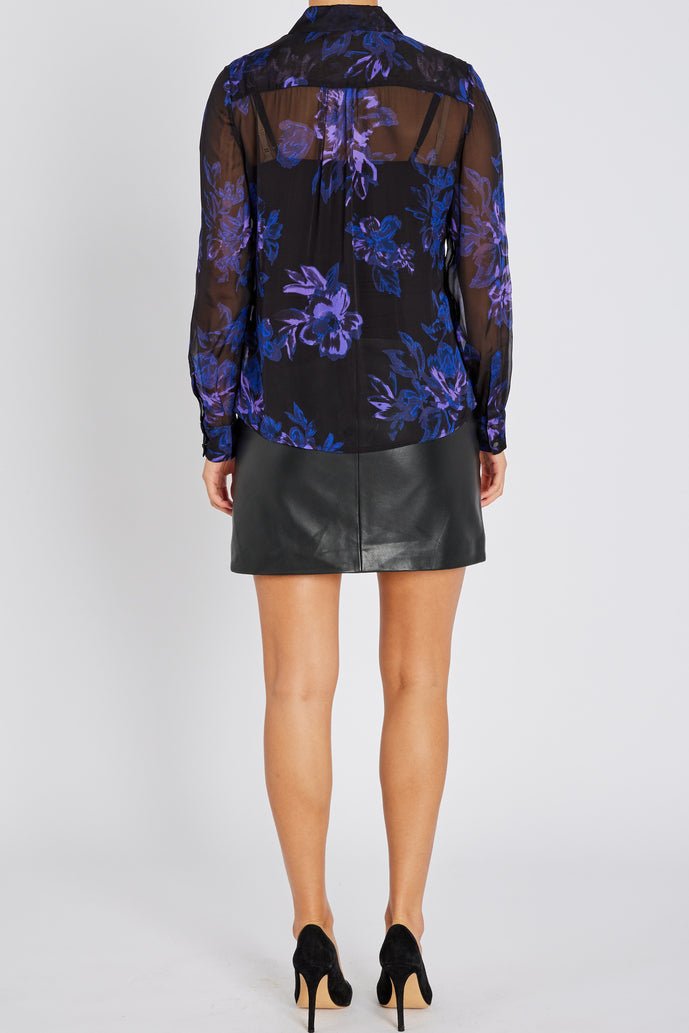 Laat je look spreken met deze elegante transparante blouse met opvallende paarse bloemenprint. De blouse is vervaardigd uit een luchtige, doorschijnende stof die een verfijnde en vrouwelijke uitstraling geeft.