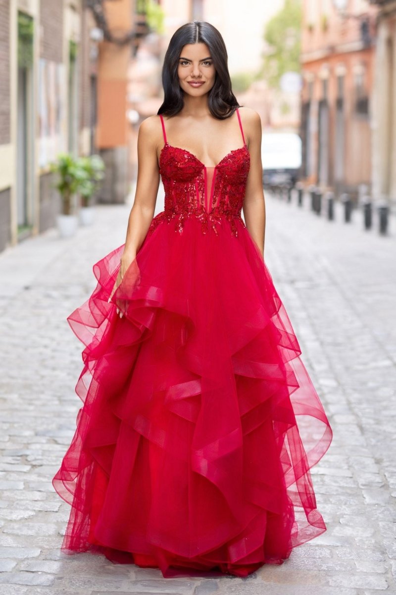 Deze spectaculaire tule galajurk met gelaagde rok is een echte blikvanger voor iedere bijzondere gelegenheid. Het verfijnde, gecorseerde lijfje is rijk gedecoreerd met luxe borduursels en subtiele pailletten, wat zorgt voor een elegante en vrouwelijke uitstraling. De diepe V-hals met transparant inzetstuk accentueert het decolleté op stijlvolle wijze, terwijl de smalle schouderbandjes het geheel een verfijnde look geven.