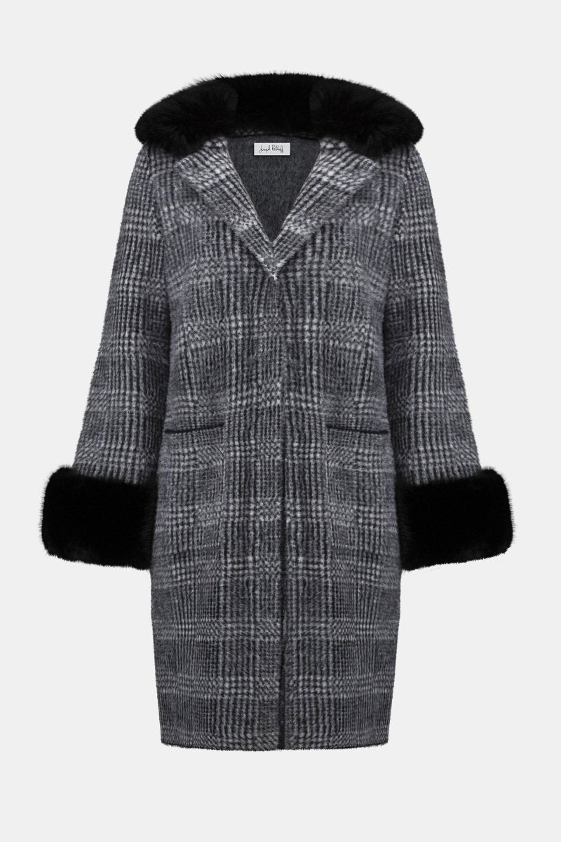 Deze stijlvolle jas van Joseph Ribkoff is een moderne klassieker die luxe en comfort naadloos combineert. Het verfijnde ruitpatroon in tijdloos zwart en grijs wordt prachtig geaccentueerd door de contrasterende faux fur kraag en mouwboorden, wat een extra vleugje elegantie toevoegt aan je wintergarderobe.