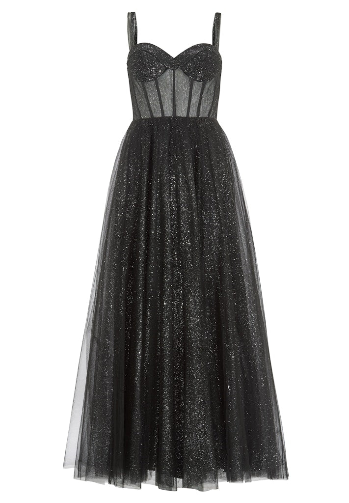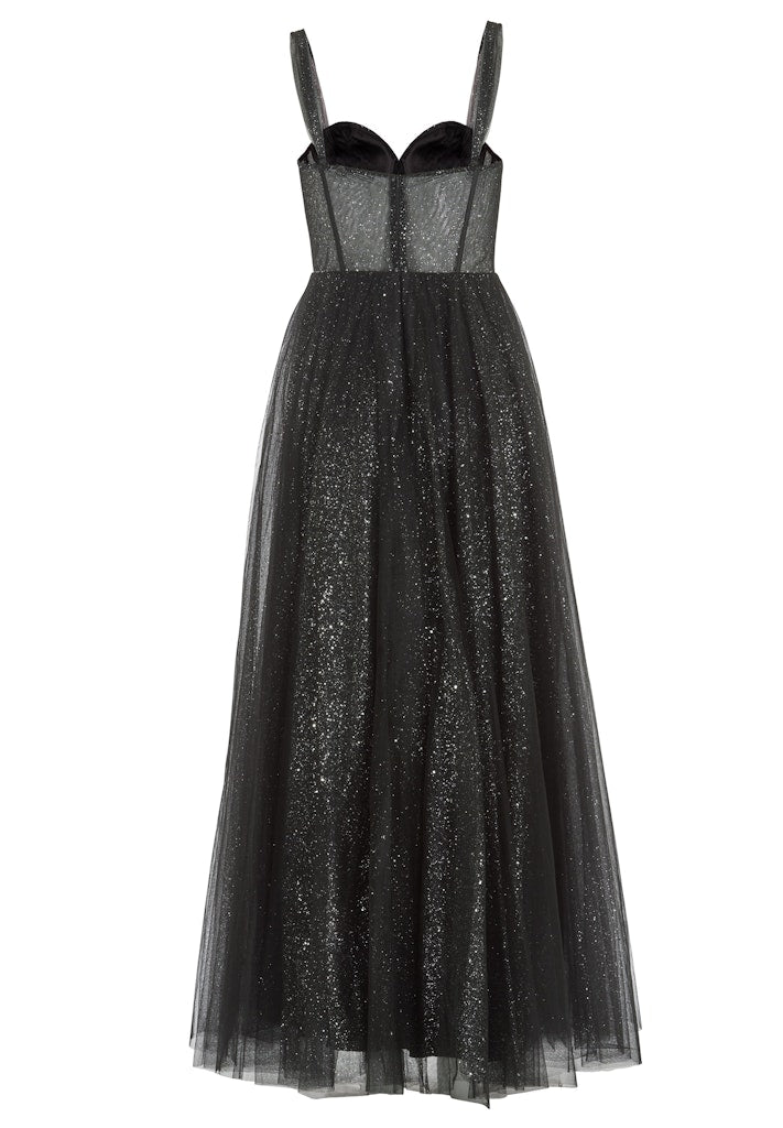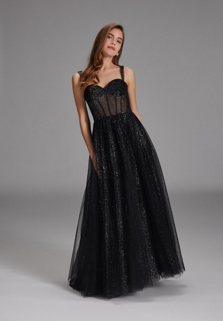 Straal in stijl met deze betoverende avondjurk! De fonkelende details en het corsage-achtige, figuuraccentuerende bovenstuk benadrukken je silhouet, terwijl de soepel vallende rok een gevoel van luchtigheid en elegantie toevoegt.