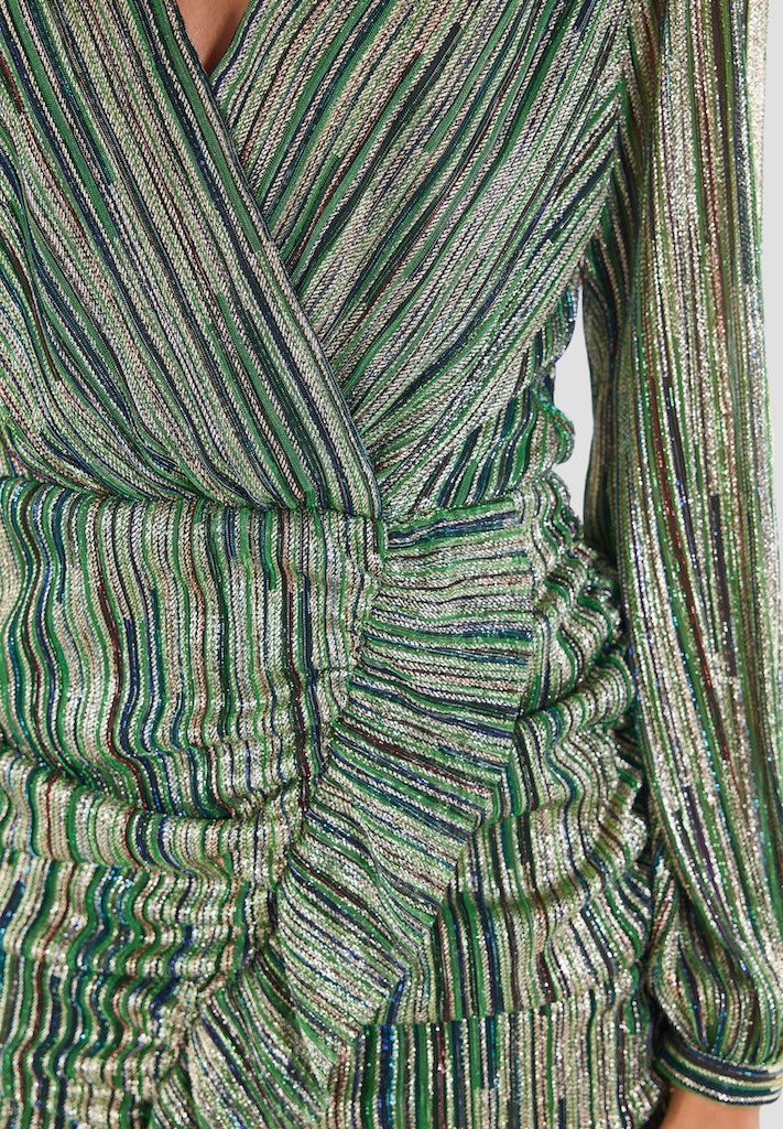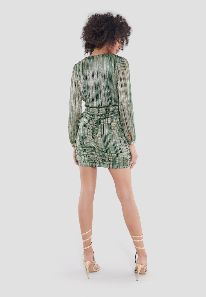 A cocktail dress suitable for different occasions! Glitter & glamour! The dress has a v-neck, long sleeves and falls above the knee. The waist is fitted and the fabric is gathered over the stomach.