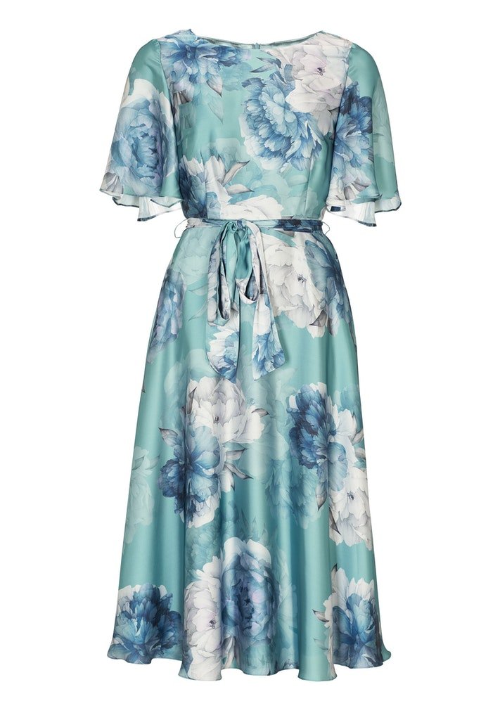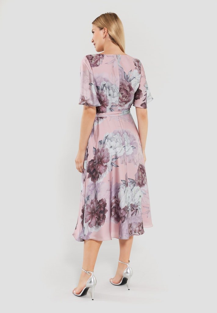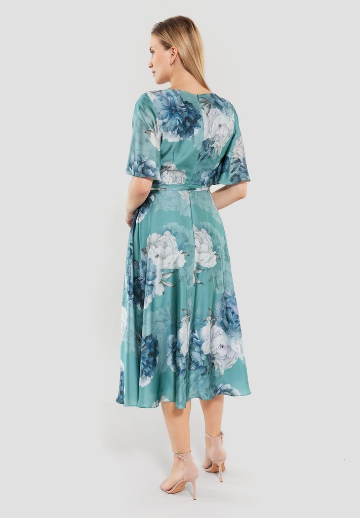 A floral print on a satin cloth, what more could you want? This dress has a midi length, round neckline and short sleeves. Flowy and also beautifully fitted at the waist.