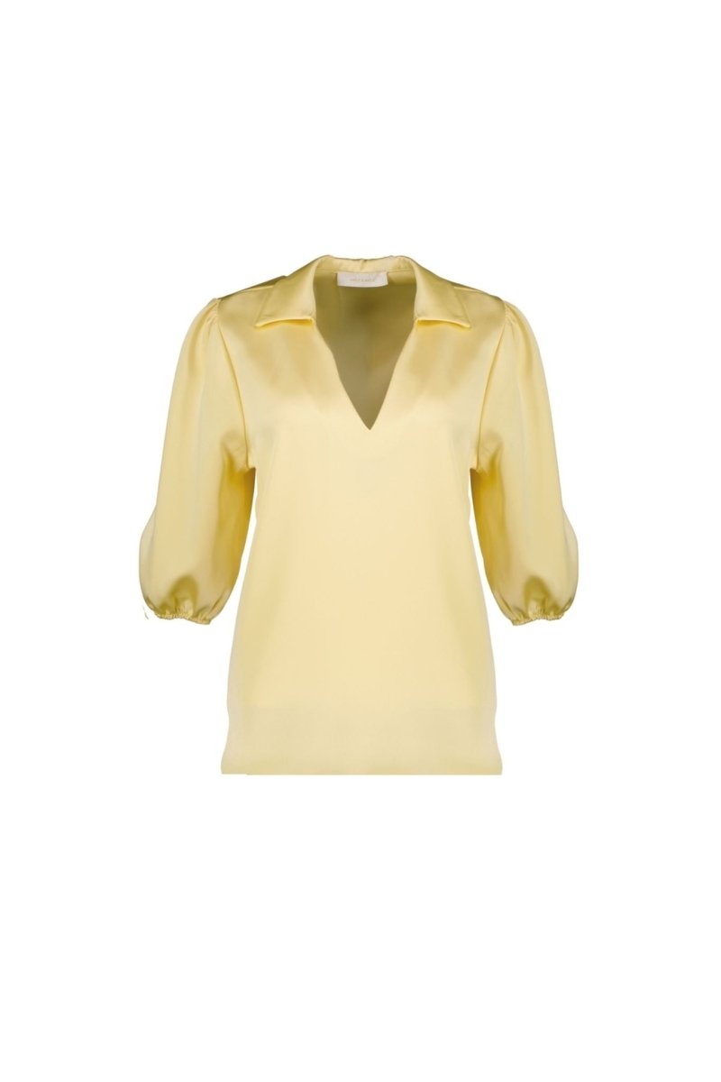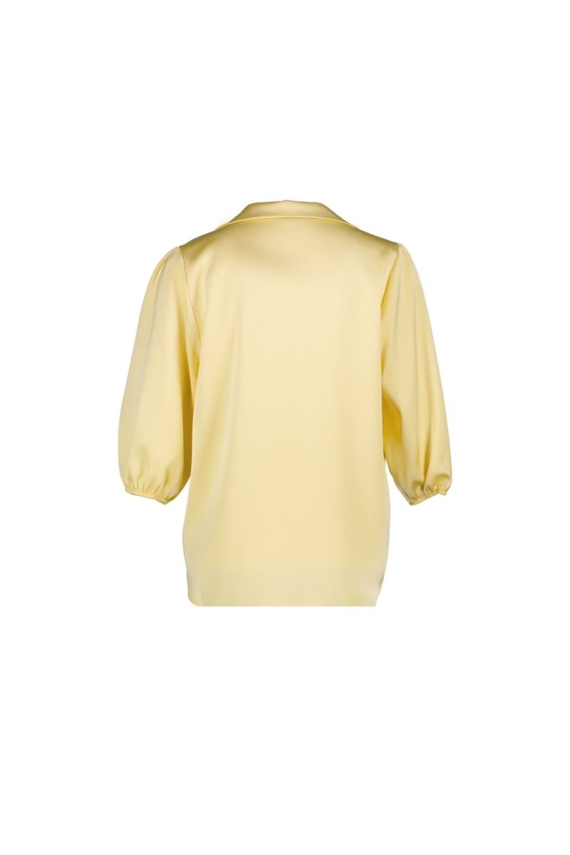 Deze verfijnde blouse heeft een vrouwelijke en stijlvolle uitstraling dankzij de soepele satijnen stof met subtiele glans. De elegante V-hals met kraag geeft de blouse een chique touch, terwijl de driekwart mouwen met licht gepofte schouders zorgen voor een moderne en flatterende look.