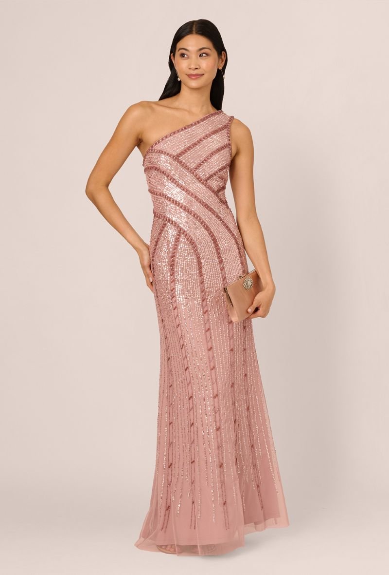 Laat je betoveren door pure elegantie met deze schitterende avondjurk van Adrianna Papell. Deze one-shoulder galajurk is uitgevoerd in een verfijnde oudroze tint en volledig versierd met met de hand aangebrachte pailletten in een prachtig geometrisch patroon. De asymmetrische halslijn en het nauwsluitende silhouet zorgen voor een vrouwelijke en verfijnde uitstraling, terwijl de vloeiend vallende rok je bewegingen elegant accentueert.