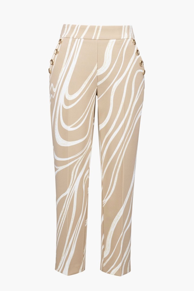 De subtiele sierknopen aan de zijkant geven de pantalon een chique, onderscheidend detail en maken het ontwerp nét even anders. Dankzij de soepele, licht gestructureerde stof draagt de broek comfortabel en behoudt deze mooi zijn vorm gedurende de dag.