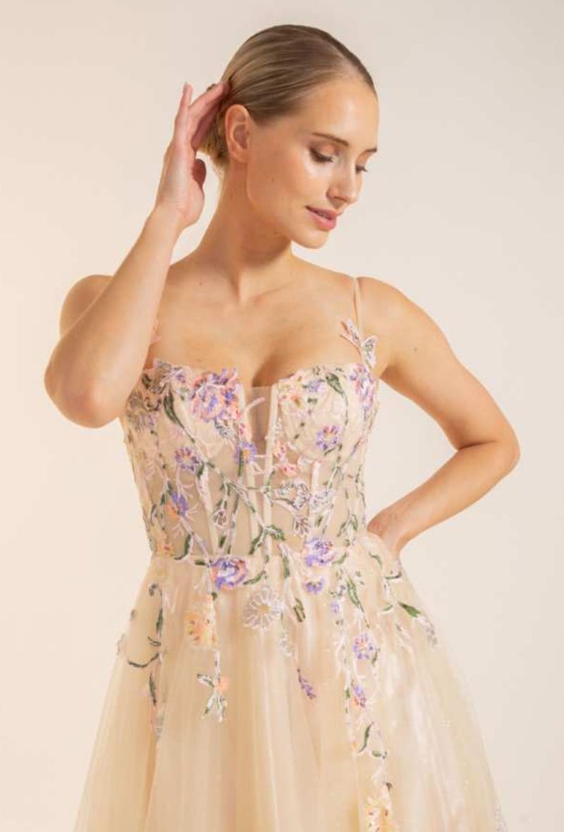 Deze betoverende gala jurk straalt pure elegantie en verfijning uit. De jurk is uitgevoerd in een zachte champagnekleurige tule en rijkelijk versierd met verfijnde bloemenborduursels in subtiele pasteltinten. Het transparante corsage-lijfje met lichte baleinen zorgt voor een prachtig silhouet en een elegante ondersteuning, terwijl de fijne schouderbandjes de jurk een vrouwelijke en delicate uitstraling geven.