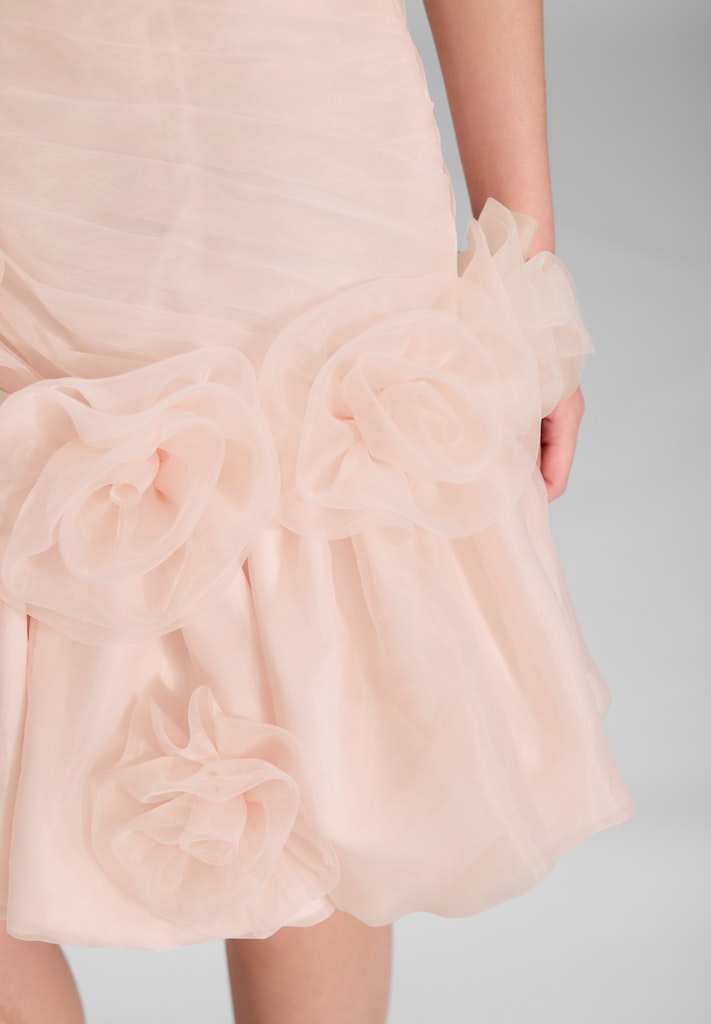 De speelse rok is afgewerkt met volumineuze bloemdetails van tule, die zorgen voor een romantisch en luxueus accent. Dankzij de aansluitende pasvorm en de luchtige afwerking aan de zoom combineert deze jurk elegantie met draagcomfort en bewegingsvrijheid.