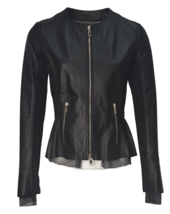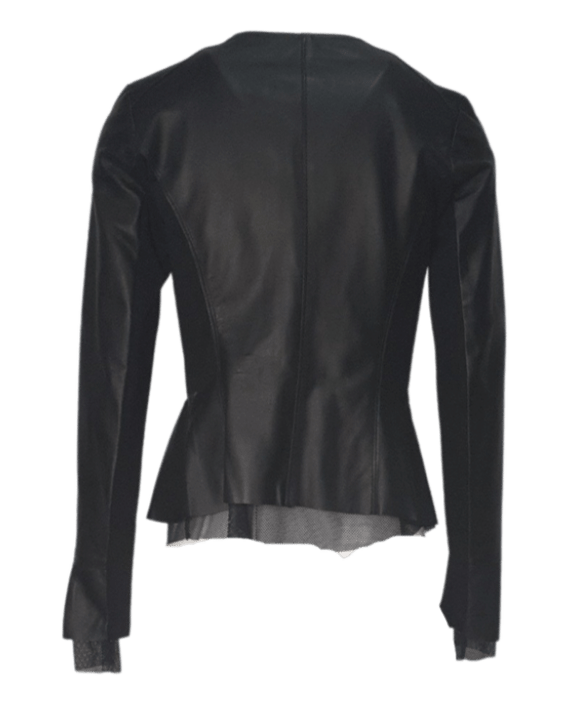 Italiaans design echt lederen jas van lamsleer. Dit soepele lederen jasje zit mooi aangesloten doordat er een jersey stretch stof verwerkt zit aan beide zijkanten. Er komt tulle aan de onderkant uit het jasje om een extra leuk effect te creëren.