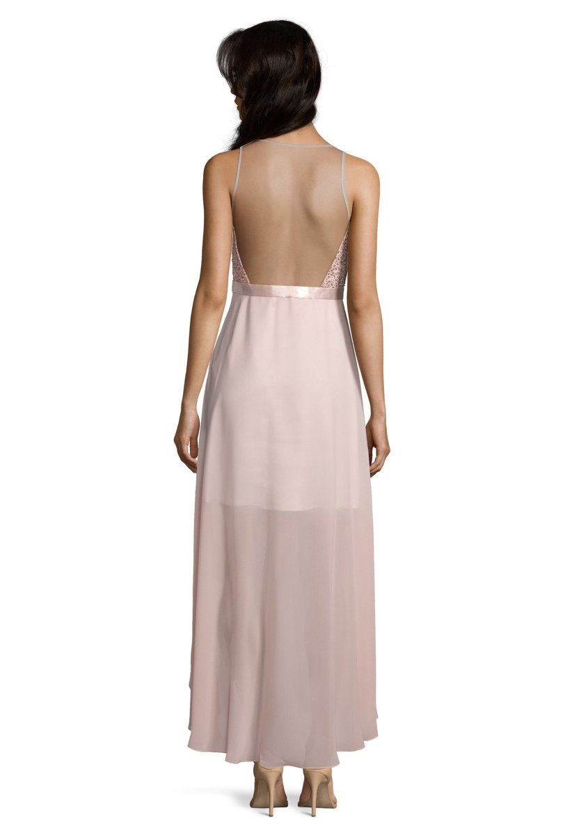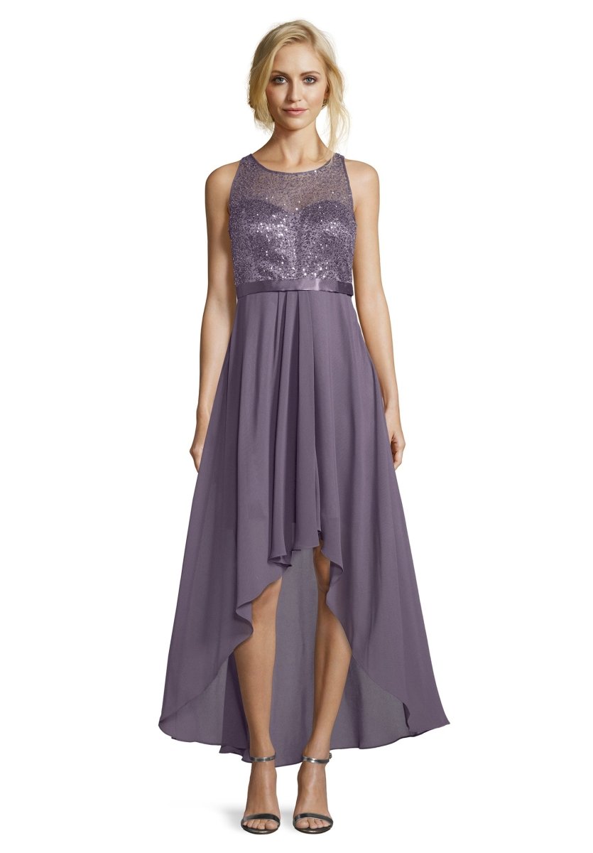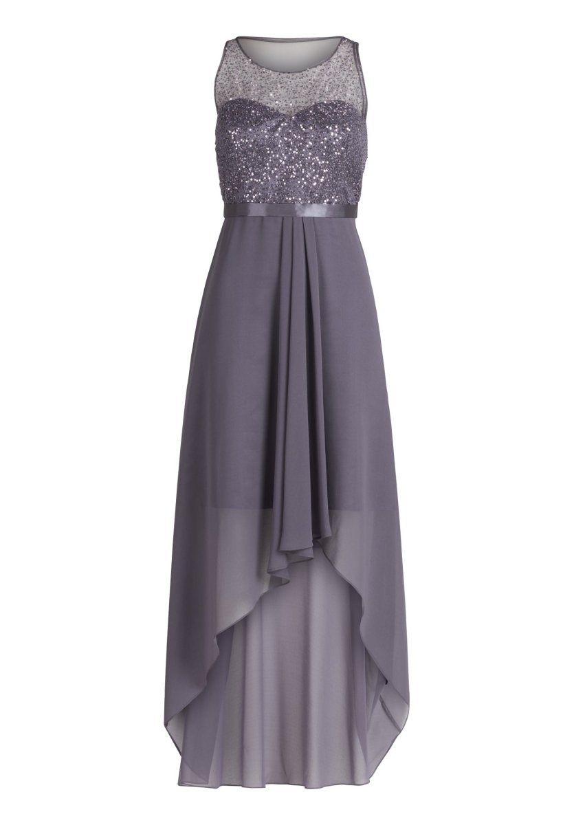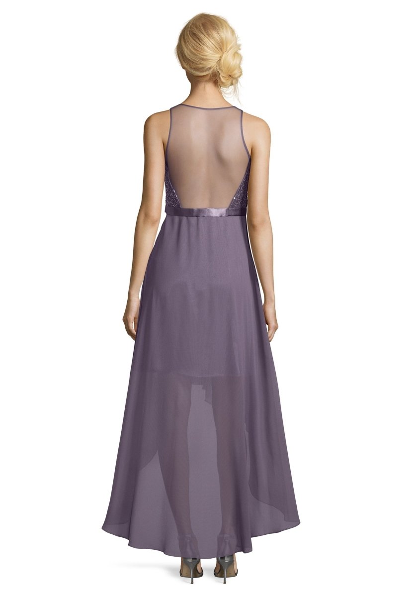 Asymetrische jurk die voor korter is en achter langer. De top is prachtig voorzien van pailetten en loopt vanuit de taille zwierig uit. De achterzijde is gemaakt van doorschijnend chiffon.