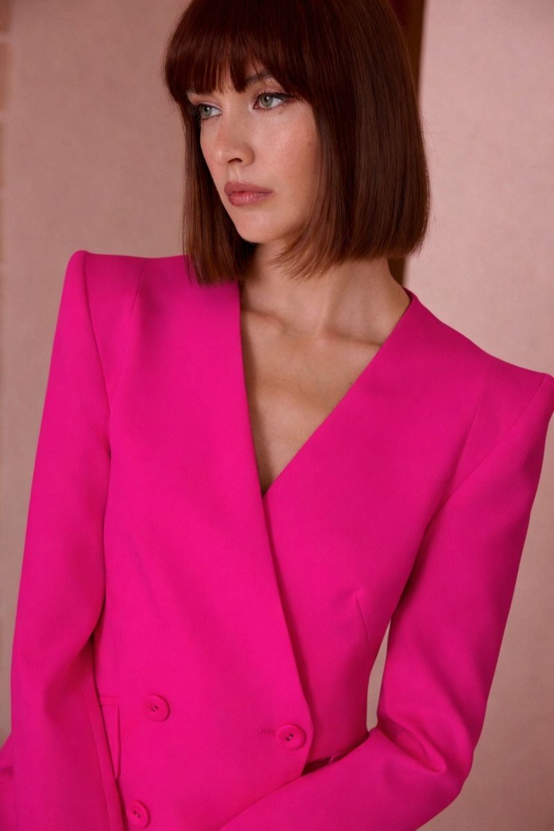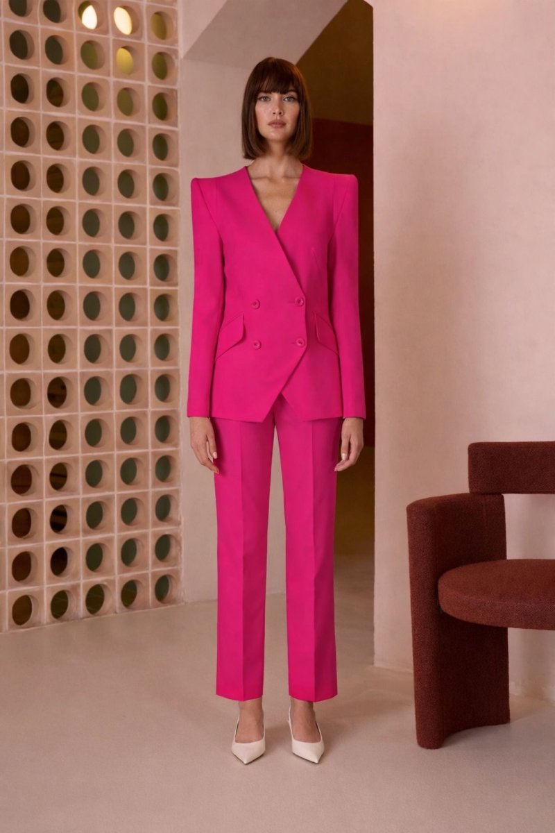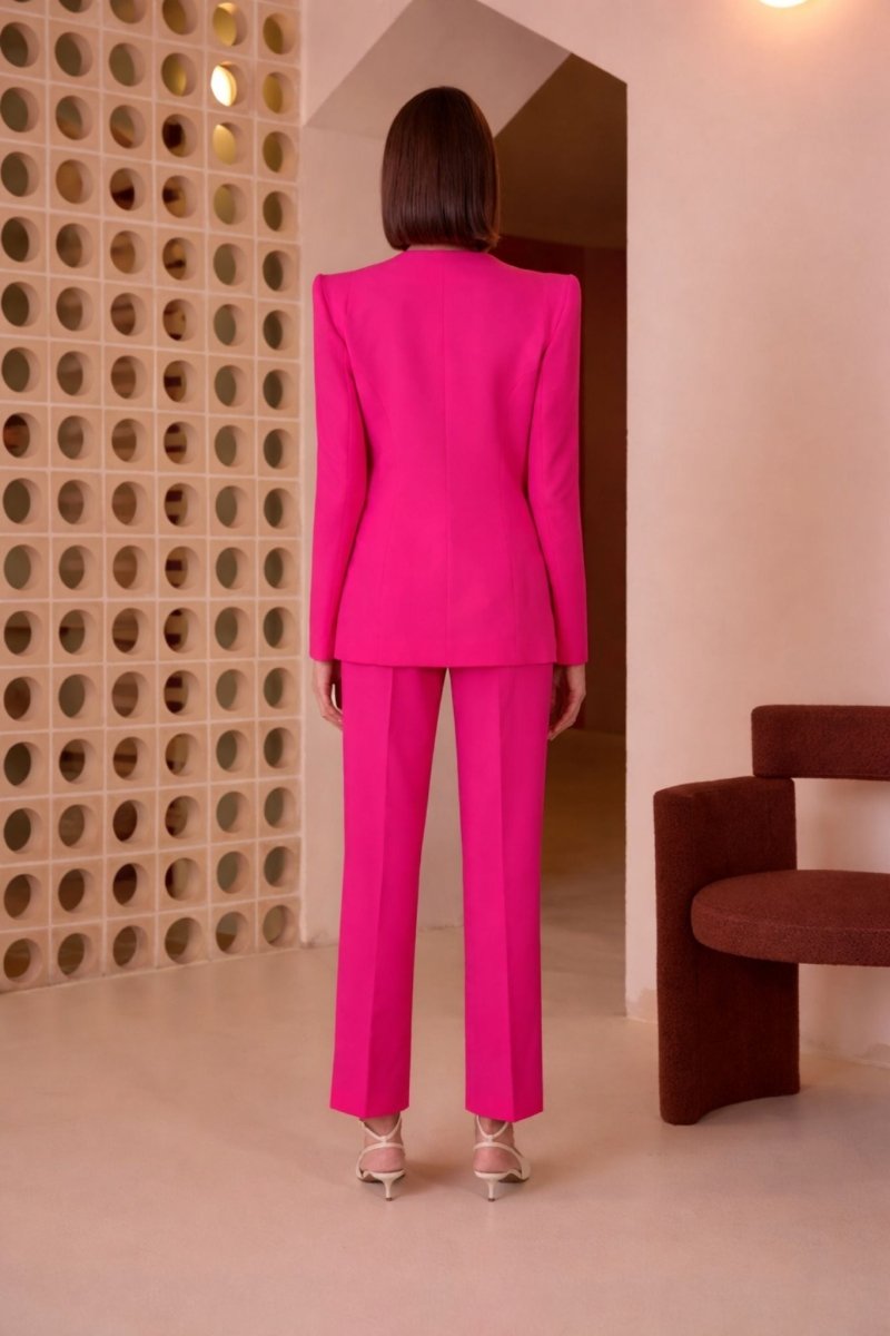 Maak een onuitwisbare indruk met deze elegante tweedelige set in een krachtige fuchsiatint. De combinatie van een getailleerde blazer en een perfect gesneden pantalon straalt zelfvertrouwen, vrouwelijkheid en moderne klasse uit.
