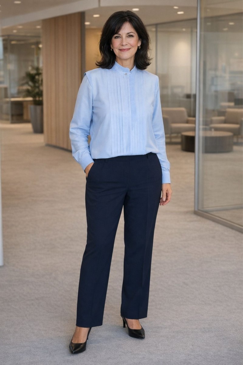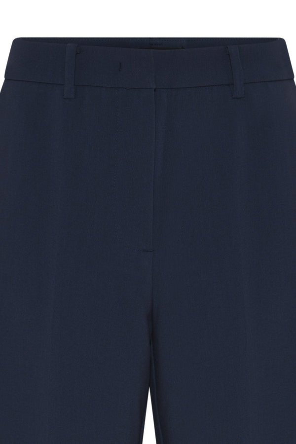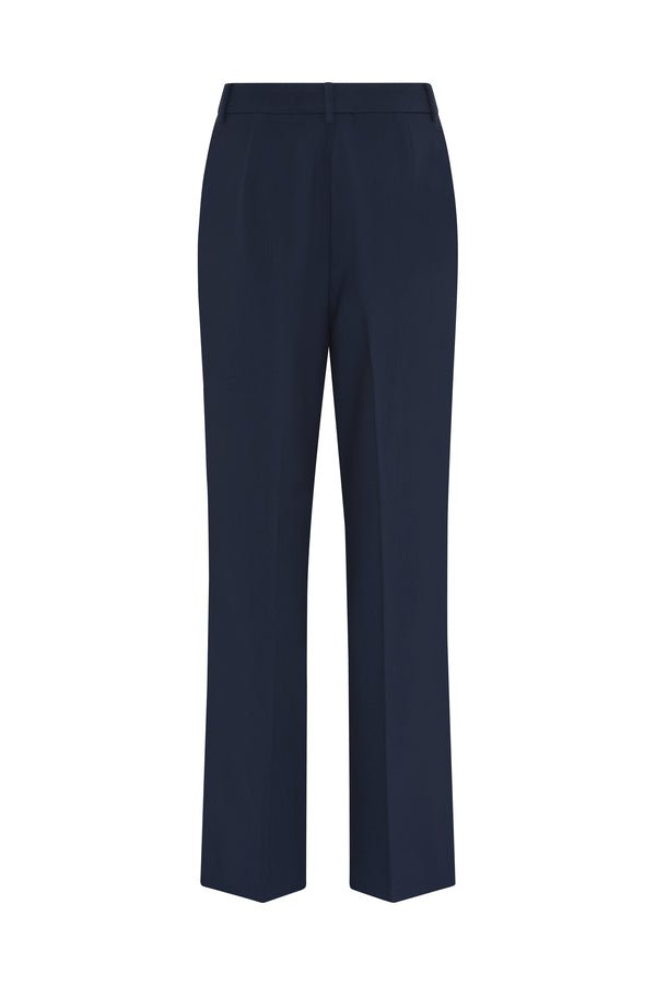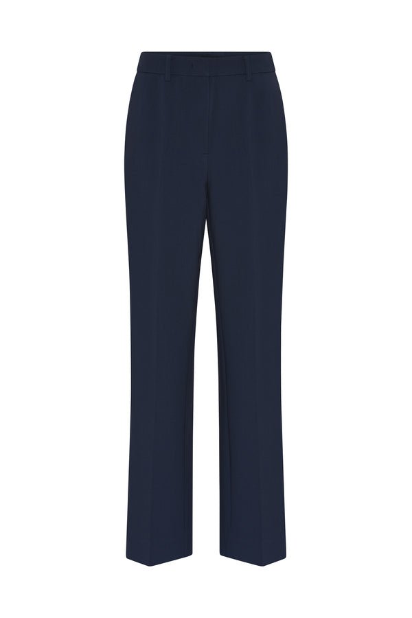 Deze elegante donkerblauwe pantalon is een tijdloze en duurzame keuze voor de moderne, zakelijke garderobe. Het rechte, licht taps toelopende silhouet zorgt voor een verzorgde en flatterende pasvorm, terwijl de persvouw de broek een klassieke, professionele uitstraling geeft. De middelhoge taille en strakke afwerking maken deze pantalon geschikt voor zowel kantoor als formele gelegenheden.