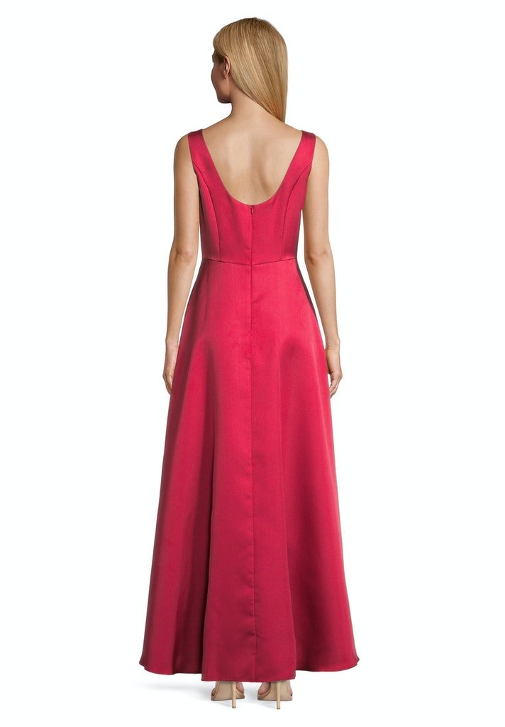Asymetrische satijnen avondjurk met ronde halsllijn en getailleerde taille. De rok loopt uit.