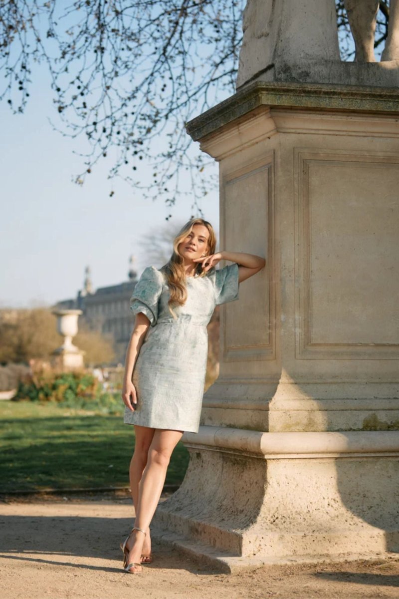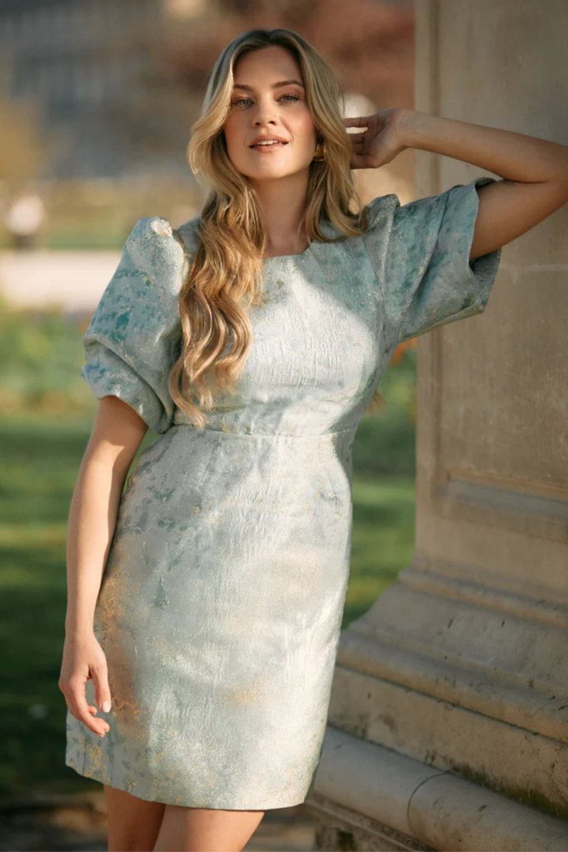 De pofmouwen geven de jurk een speelse, maar krachtige touch, terwijl de rechte pasvorm en de kortere lengte het geheel vrouwelijk en modern houden. Dankzij de elegante ronde hals en de subtiele sluiting op de rug blijft de look stijlvol en tijdloos.