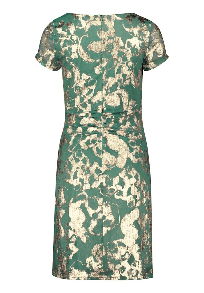 Deze sierlijke jurk met korte mouwen en ronde hals is een verfijnde keuze voor feestelijke gelegenheden. Het knielange model combineert een klassieke pasvorm met een opvallend florale print, uitgevoerd in een glanzende afwerking die het licht prachtig vangt. Dankzij de ritssluiting aan de achterzijde sluit de jurk mooi aan en blijft het silhouet elegant en comfortabel.