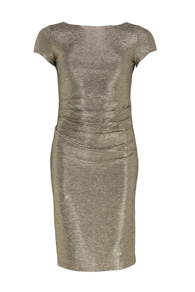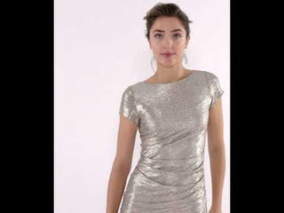 Een schitterende cocktail jurk die mee rekt en door de drapering mooi valt om je buik. De jurk heeft een korte mouw, ronde hals en valt op knielengte.