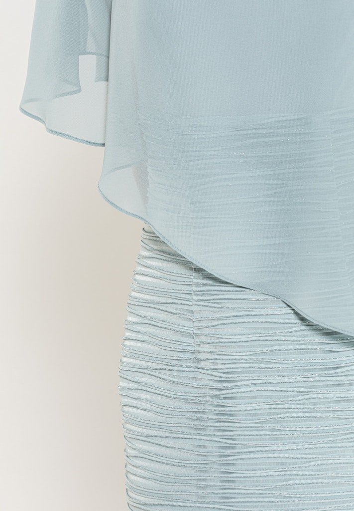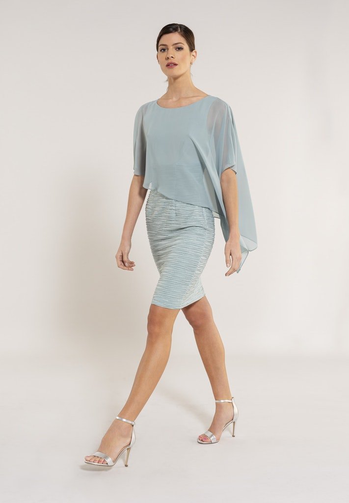 Dit model jurk valt altijd erg goed in de smaak omdat deze mooi aangesloten op je lijft valt en door de losvallende chiffon top (niet afneembaar) heb je gelijk je armen bedekt. De jurk zelf rekt mee en valt rond om de knie.