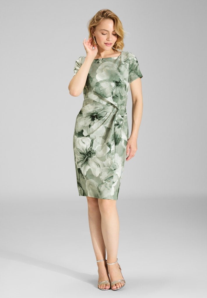 Het bovenlijf heeft een klassieke ronde hals en korte mouwtjes, waardoor de jurk tijdloos en stijlvol blijft. De geplooide details in de taille creëren een mooi silhouet en zorgen voor een subtiel corrigerend effect. De knielengte maakt de look chic en veelzijdig, perfect voor zowel formele als feestelijke momenten.