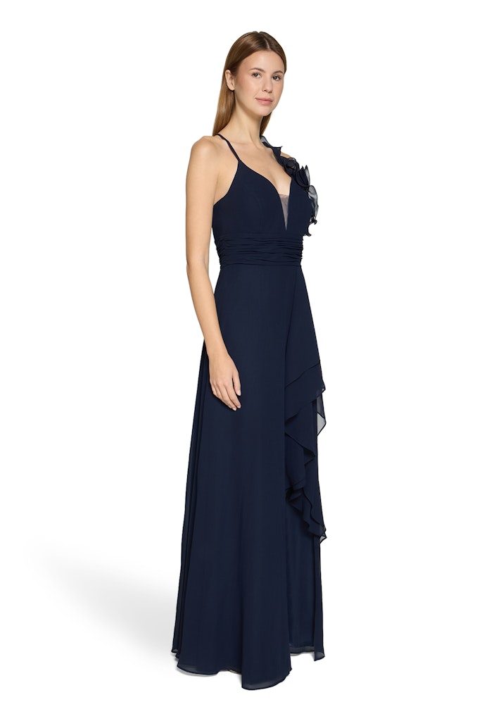 Deze elegante gala jurk is een tijdloze keuze voor bijzondere gelegenheden zoals een bruiloft, gala of formeel avondfeest. Het verfijnde ontwerp combineert een vrouwelijke V-hals met fijne, gekruiste schouderbandjes die zorgen voor een elegante en lichte uitstraling. Op één schouder is de jurk afgewerkt met een subtiele organza bloem, wat een chique en exclusief detail toevoegt.