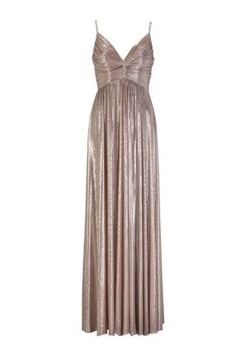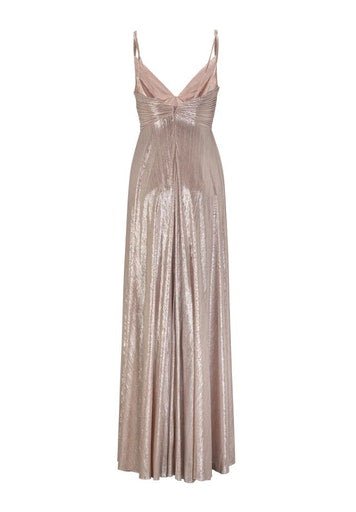 Een bijzonder mooie jurk met een korte onderjurk en een lang vallende rom met split. De jurk heeft spaghetti bandjes en een prachtige glans over de hele stof. Een jurk perfect om te schitteren op een gala!