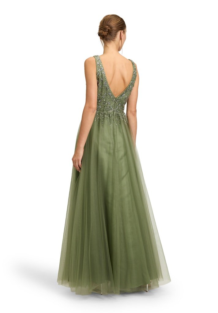 Elegante prinsessenjurk in een zachte saliegroene kleur. Deze jurk heeft een flatterende V-hals en een mouwloos ontwerp, wat zorgt voor een vrouwelijke en stijlvolle uitstraling. De top is rijkelijk versierd met fijne steentjes die subtiel glinsteren bij elke beweging. Het uitlopende model geeft de jurk een klassieke prinsessenlook, perfect voor gala’s, bruiloften of andere feestelijke gelegenheden. De combinatie van de verfijnde details en de romantische snit maakt deze jurk een echte eyecatcher.