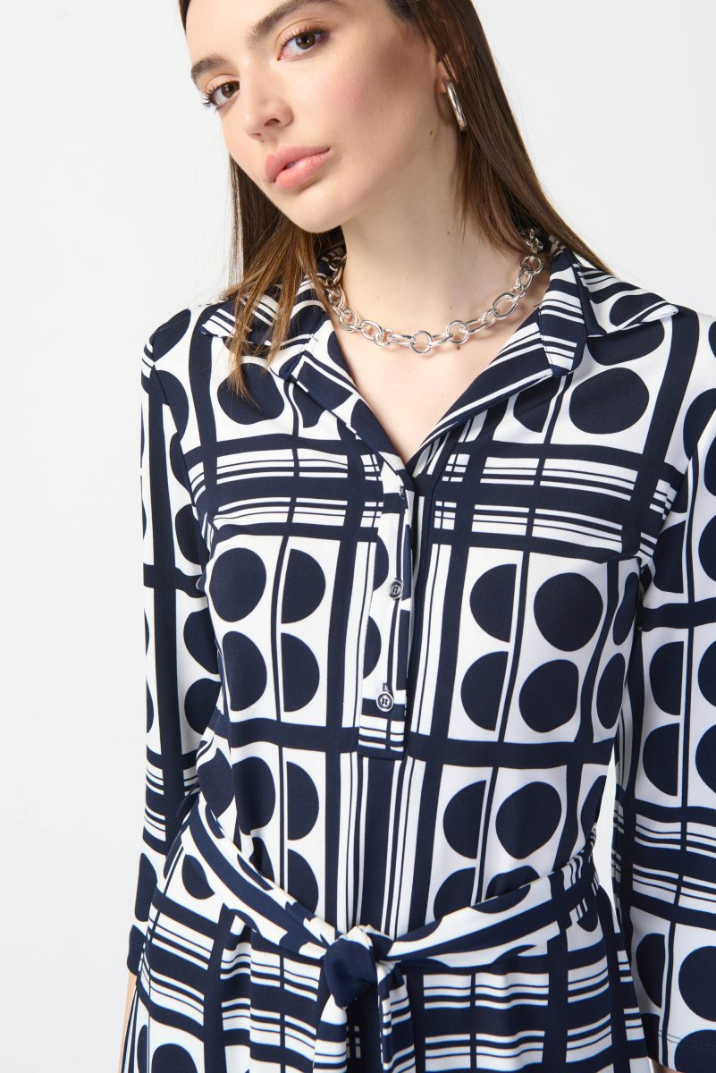 Enjoy effortless elegance with this luxurious polka dot shirt dress. Crafted from a premium, silky knit, it offers a comfortable, sophisticated look that transitions seamlessly from day to night. The elegant front placket and crisp collar add a touch of sophistication, while the three-quarter sleeves and waistband create a flattering silhouette.