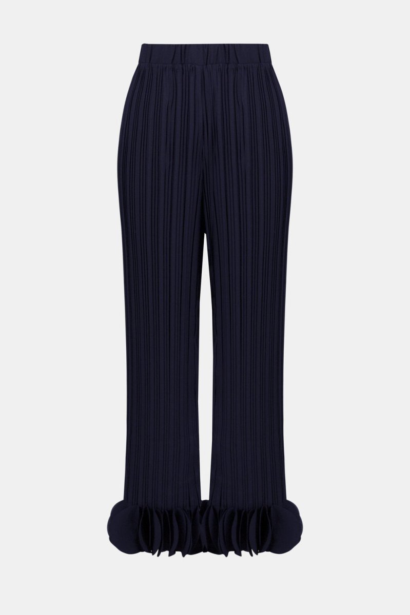 De bijzondere afwerking aan de onderzijde met speelse, gelaagde details maakt deze pantalon net even anders en geeft een exclusieve touch. Ideaal voor feestelijke gelegenheden, diners of events, maar ook stijlvol te combineren in een chique set met de bijpassende top.