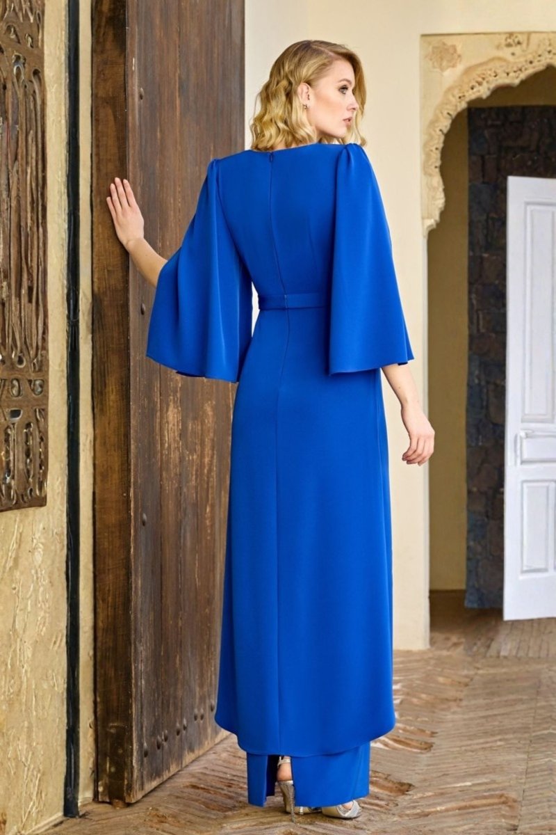 Het ontwerp heeft een elegante V-hals en een subtiel overslagdetail aan de voorzijde, wat het bovenlichaam mooi flatteert. De taille wordt geaccentueerd door een bijpassende ceintuur met een verfijnd sierdetail, waardoor een vrouwelijk silhouet ontstaat. De cape-achtige mouwen geven de jurk een moderne en chique touch en zorgen voor een sierlijke beweging bij elke stap.