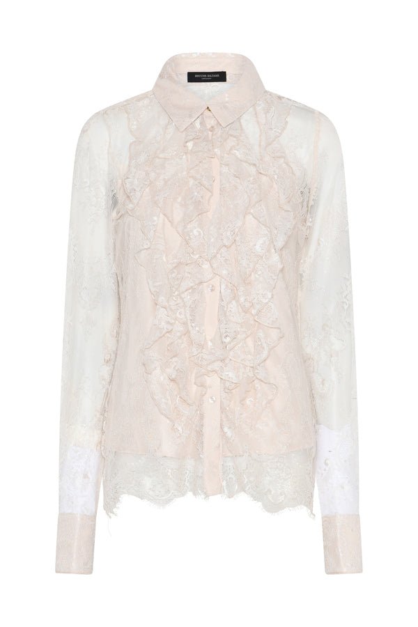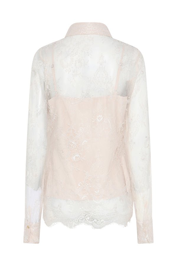 Deze romantische kanten blouse is een elegant statement piece met een verfijnde en vrouwelijke uitstraling. Het transparante ontwerp is uitgevoerd in een delicate kantkwaliteit met een subtiel bloemendessin, wat zorgt voor een luxe en lichte look. De zachte tint White Sand geeft de blouse een tijdloze en chique uitstraling.