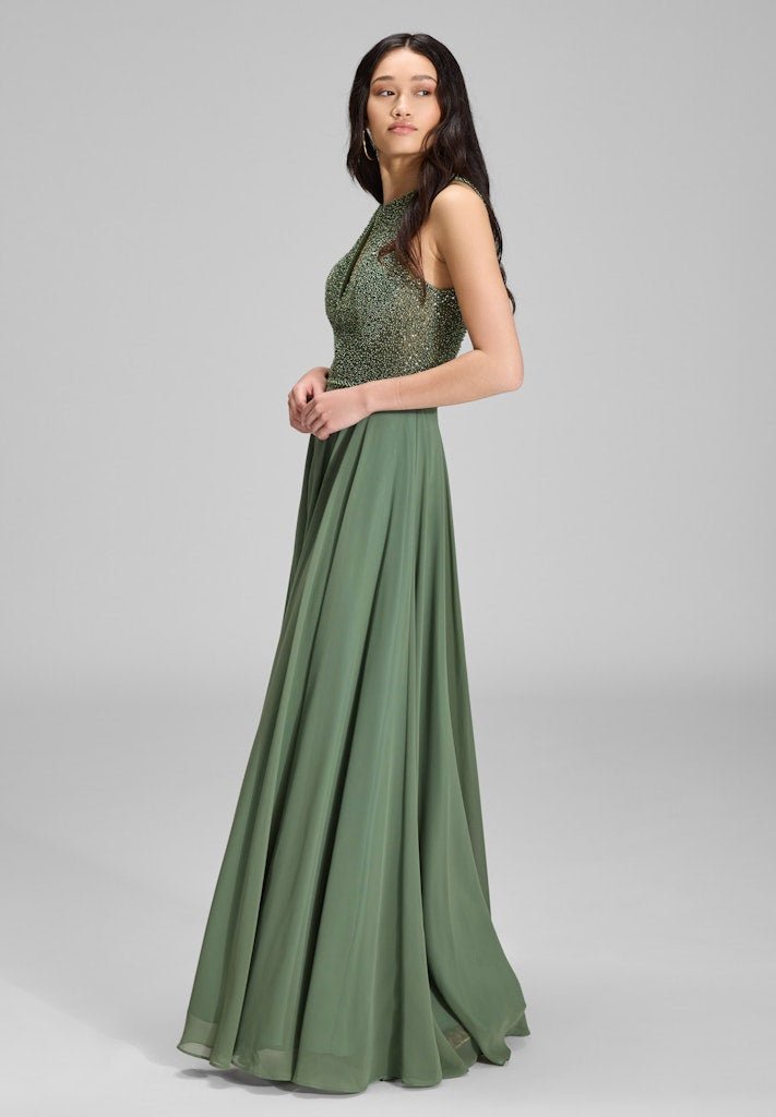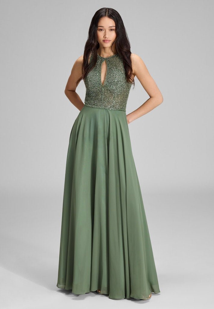 Deze elegante lange avondjurk straalt pure klasse en verfijning uit. Het lijfje is rijkelijk bezet met subtiele kraaltjes en pailletten, wat zorgt voor een luxueuze sparkle zonder te overheersen. De hoge hals met verfijnde keyhole-uitsparing aan de voorzijde geeft de jurk een vrouwelijke en moderne uitstraling.