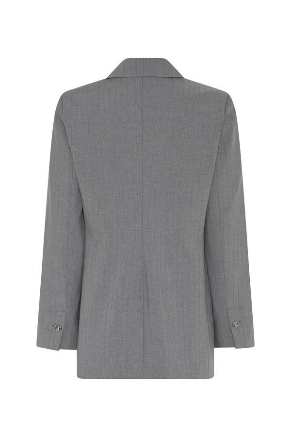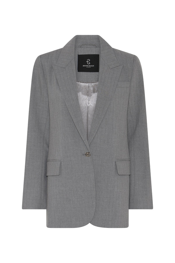 Deze elegante grijze blazer is een onmisbare klassieker binnen de zakelijke garderobe. Het tijdloze ontwerp met reverskraag en licht getailleerde pasvorm zorgt voor een vrouwelijke, krachtige uitstraling. De blazer sluit met een verfijnde knoop en is afgewerkt met klepzakken en subtiele details aan de manchetten, wat bijdraagt aan de luxe en verzorgde look.