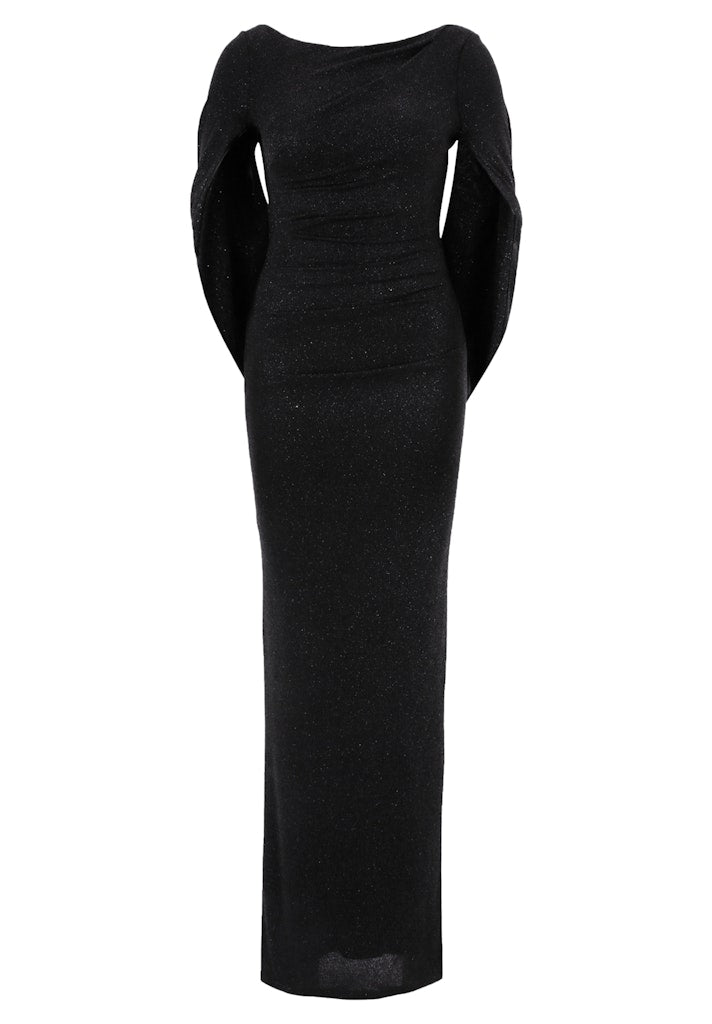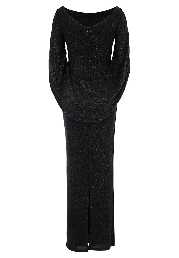 Het asymmetrische, gedrapeerde bovenlijfje zorgt voor een sierlijke en elegante uitstraling, terwijl de bijzondere cape-mouwen een vleugje drama en glamour toevoegen. De rechte, vloer-lange snit verlengt het silhouet en zorgt voor een gracieuze look.