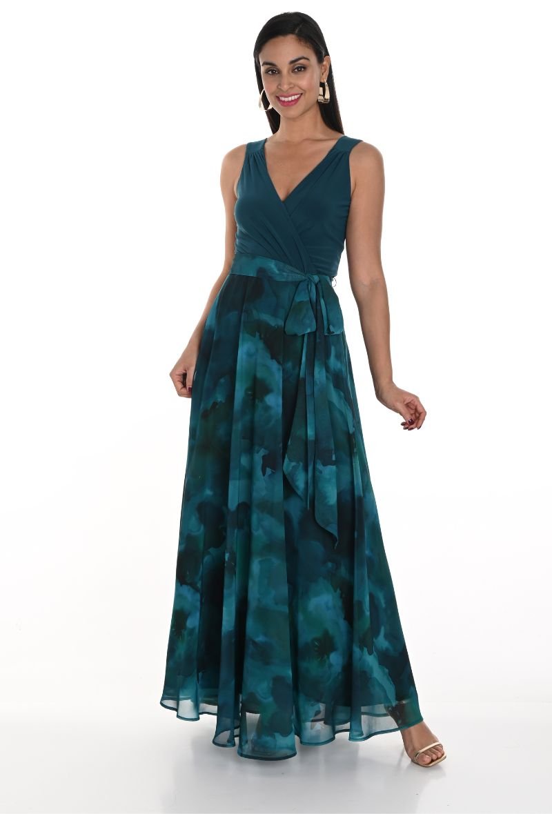Deze elegante avondjurk straalt pure klasse uit met een prachtige kleuroverloopprint in rijke petrol tinten. De vloeiende kleuren creëren een subtiele, maar betoverende look die perfect is voor speciale gelegenheden. De jurk is mouwloos en heeft een stijlvolle V-hals, wat zorgt voor een verfijnde en vrouwelijke uitstraling.