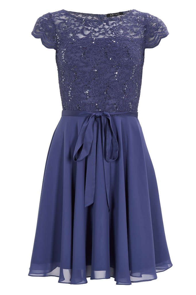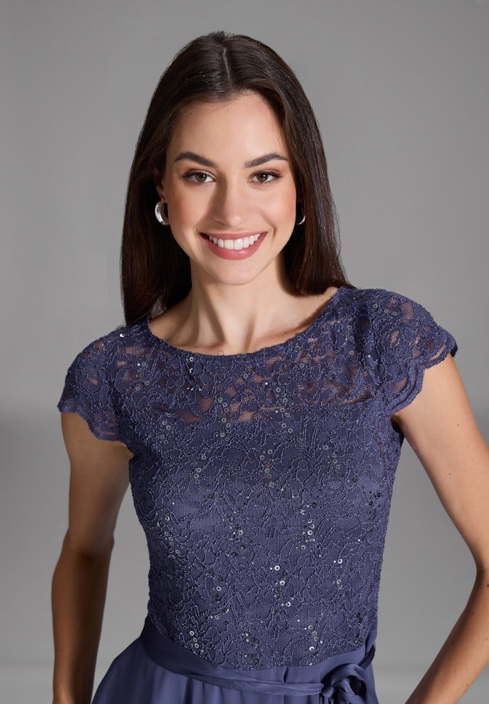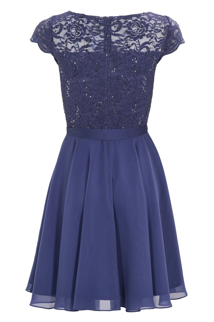 Cocktail jurk die zeer geschikt is voor een gala of bruiloft. De jurk heeft een kanten top gedeelte voorzien van pailetten, korte mouwen en valt rondom de knie. Vanuit de taille, die je met een koord extra kunt tailleren, loopt de rok soepel uit.