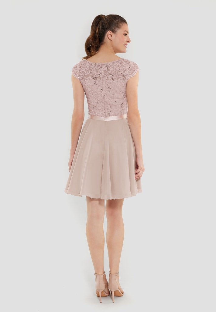Cocktail jurk die zeer geschikt is voor een gala of bruiloft. De jurk heeft een kanten top gedeelte voorzien van pailetten, korte mouwen en valt rondom de knie. Vanuit de taille, die je met een koord extra kunt tailleren, loopt de rok soepel uit.
