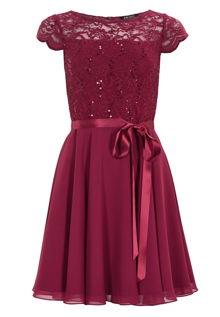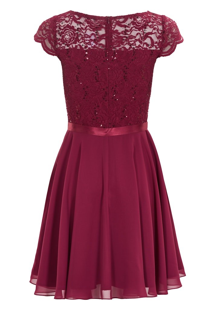 Cocktail jurk die zeer geschikt is voor een gala of bruiloft. De jurk heeft een kanten top gedeelte voorzien van pailetten, korte mouwen en valt rondom de knie. Vanuit de taille, die je met een koord extra kunt tailleren, loopt de rok soepel uit.