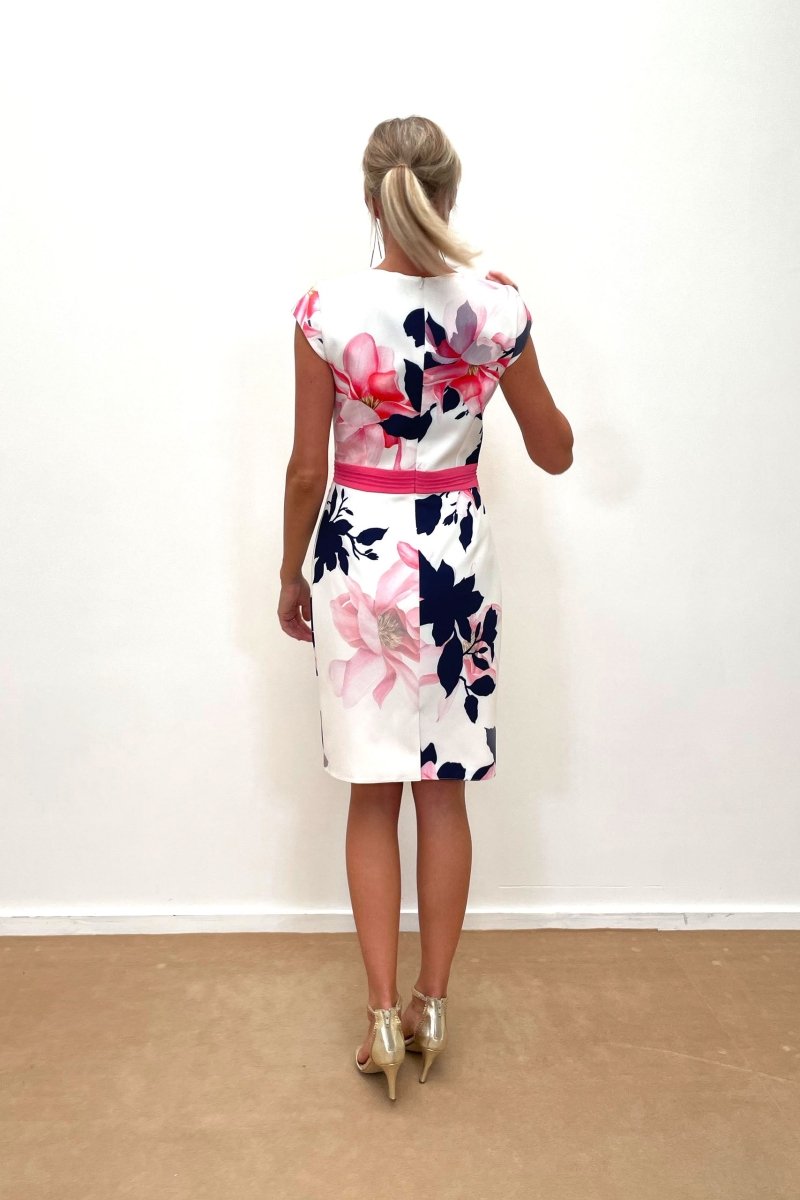 Deze 2-delige outfit met bloemenprint is perfect voor bijvoorbeeld de moeder van de bruid/bruidegom of communicant. Ook als je zelf gaat trouwen is dit een outfit die perfect is voor zo'n speciaal moment. De jurk heeft een korte mouw, v-hals en het bijpassende crepe bolero jasje heeft strikjes aan de mouw welke ook terugkomt in de tailleband van de jurk. De jurk valt rondom de knie.