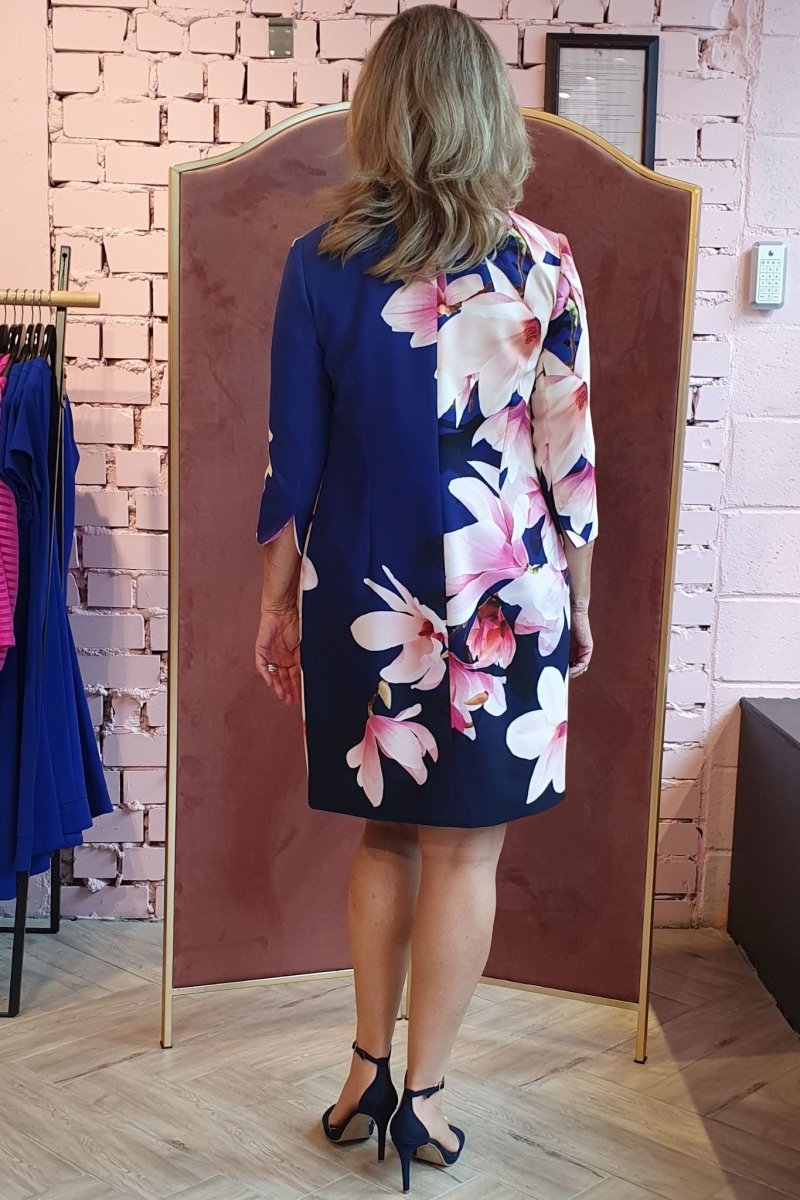 Deze elegante set van Linea Raffaelli heeft een navy kleurige jurk met strik op het voorpand en valt getailleerd. De bijbehorende mantel heeft een romantische bloemenprint en maakt de outfit compleet.