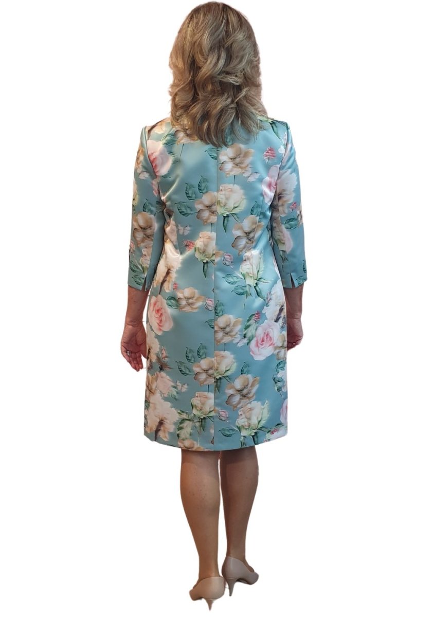 Deze schitterende cocktailjurk van het couture merk Linea Raffaelli wordt geleverd als een set met een prachtig manteljasje, beide met een verfijnde bloemenprint. De jurk heeft een elegante ronde hals en een knielange rok, met een subtiel kettingdetail op de tailleband dat een vleugje glamour toevoegt. Deze outfit is perfect geschikt voor de moeder van de bruid of bruidegom, en straalt tijdloze stijl en verfijning uit voor een onvergetelijke speciale gelegenheid.