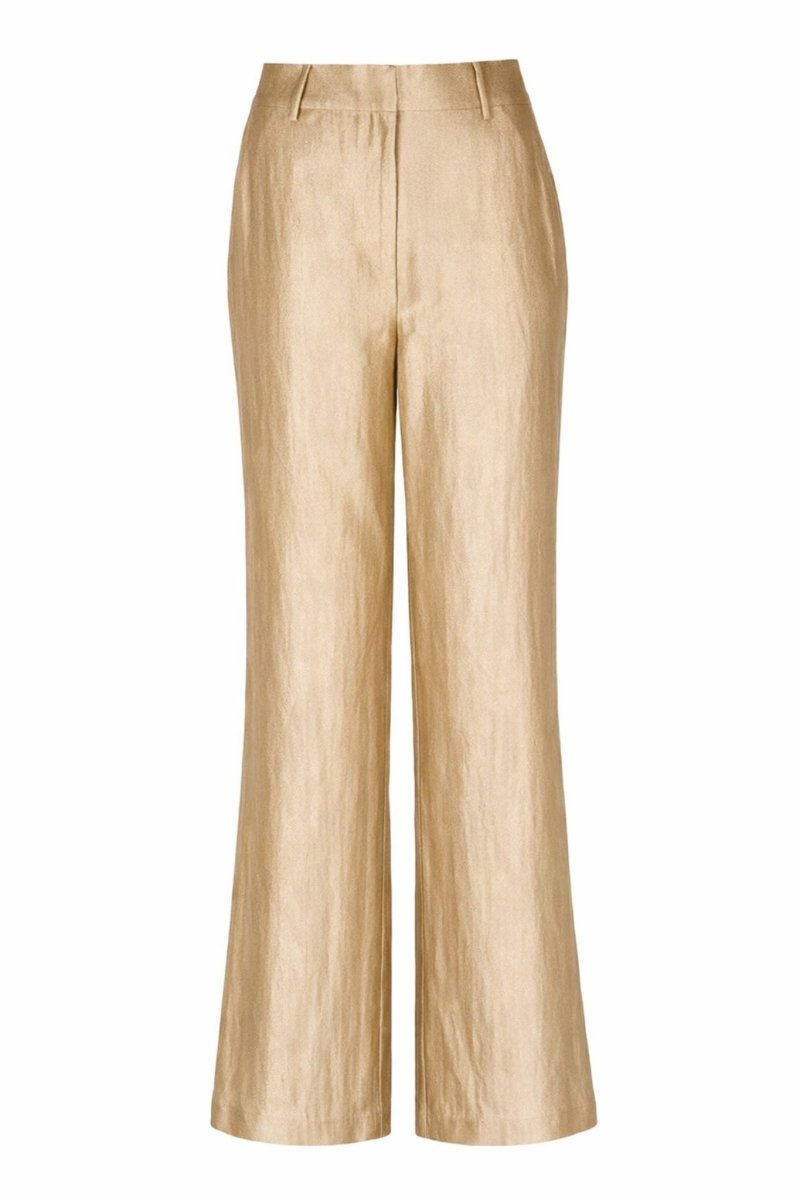 De pantalon is voorzien van een blinde sluiting en een minimalistische afwerking, waardoor de rijke goudtint volledig tot zijn recht komt. De rechte, licht uitlopende pijpen zorgen voor een stijlvolle en tijdloze look die zowel chic als krachtig oogt.