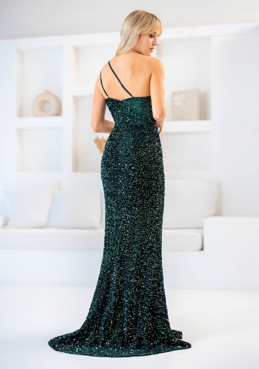 Deze spectaculaire gala jurk is ontworpen om indruk te maken. De jurk is volledig bezet met fonkelende pailletten en heeft een elegante one-shoulder halslijn met een verfijnd schouderbandje, wat zorgt voor een moderne en vrouwelijke uitstraling. De aangesloten pasvorm benadrukt het silhouet op elegante wijze, terwijl de subtiele tailleband extra definitie geeft.