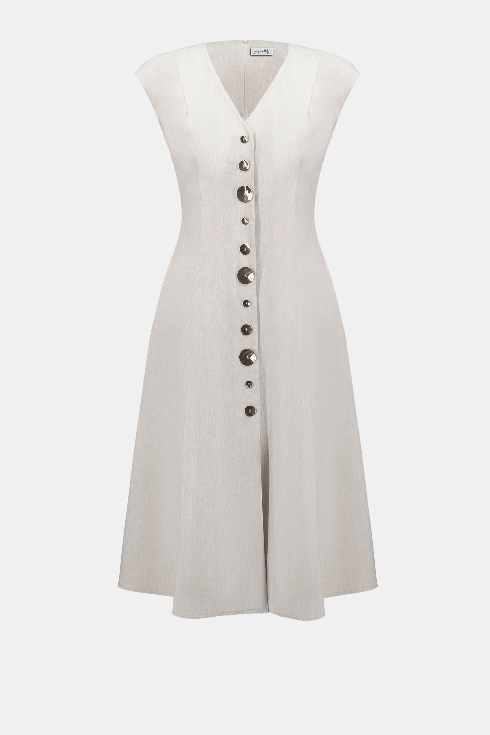 Deze verfijnde midi jurk straalt tijdloze elegantie uit en is perfect voor zowel stijlvolle dagelijkse momenten als meer geklede gelegenheden. Het model heeft een vrouwelijke A-lijn pasvorm die het silhouet prachtig volgt en zorgt voor een flatterend en comfortabel draaggevoel. De diepe V-hals en de rij decoratieve knopen aan de voorzijde geven de jurk een subtiele, luxe uitstraling, terwijl de lichte schouderlijn het geheel een moderne en verfijnde touch geeft.